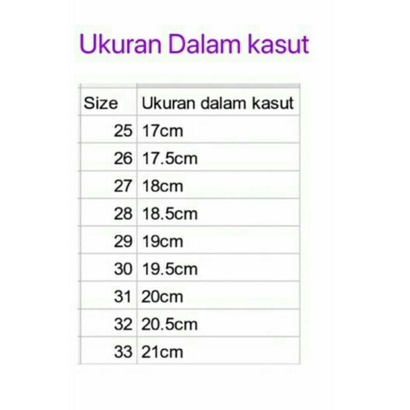Saiz kasut adalah fleksibel atau boleh laras. Saiz kasut kanak kanak mengikut umur malayruda. Pengukuran ASPengukuran UKPengukuran EU.